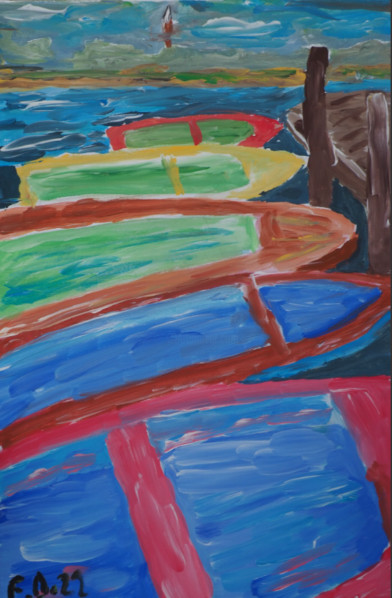 Blau steht für Tiefe, für das, was verborgen bleibt. Die Linien erinnern an Hafenmauern, an Wege, die sich im Wasser spiegeln. Jede Spur Farbe ist hier ein Versuch zu sprechen, ohne Worte zu benutzen – nur durch Rhythmus, Form und Klang.